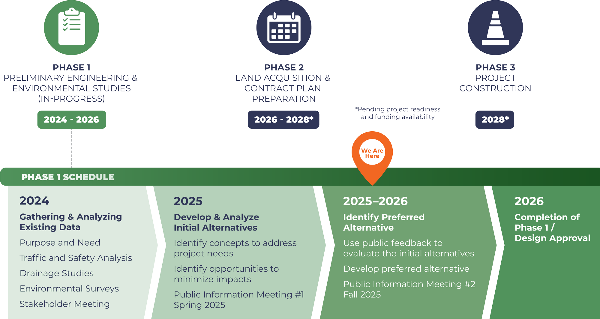 - Phase 1 includes all tasks related to preliminary engineering and environmental studies, in progress now, which will take place during the years 2024-2026. The phase 1 schedule has four stag-es. Stage 1 took place in 2024 and included gathering and analyzing existing data, used for development of the Purpose and Need, traffic and safety analysis, drainage studies, environmental surveys, and stakeholder meetings. Stage 2 takes place in 2025 and includes developing and analyzing initial alternatives, used to identify concepts to address project needs, and identify opportunities to minimize impacts. Public Information Meeting #1 takes place during this phase, in the Spring. Stage 3 will take place in 2025 and 2026 and includes identifying the preferred alternative. In this stage, the team uses public feedback to evaluate the initial alternatives, develops the preferred alternative, and hosts Public Information Meeting #2 in Fall of 2025. In early 2026, Phase 1 of the study is completed and the design is approved.